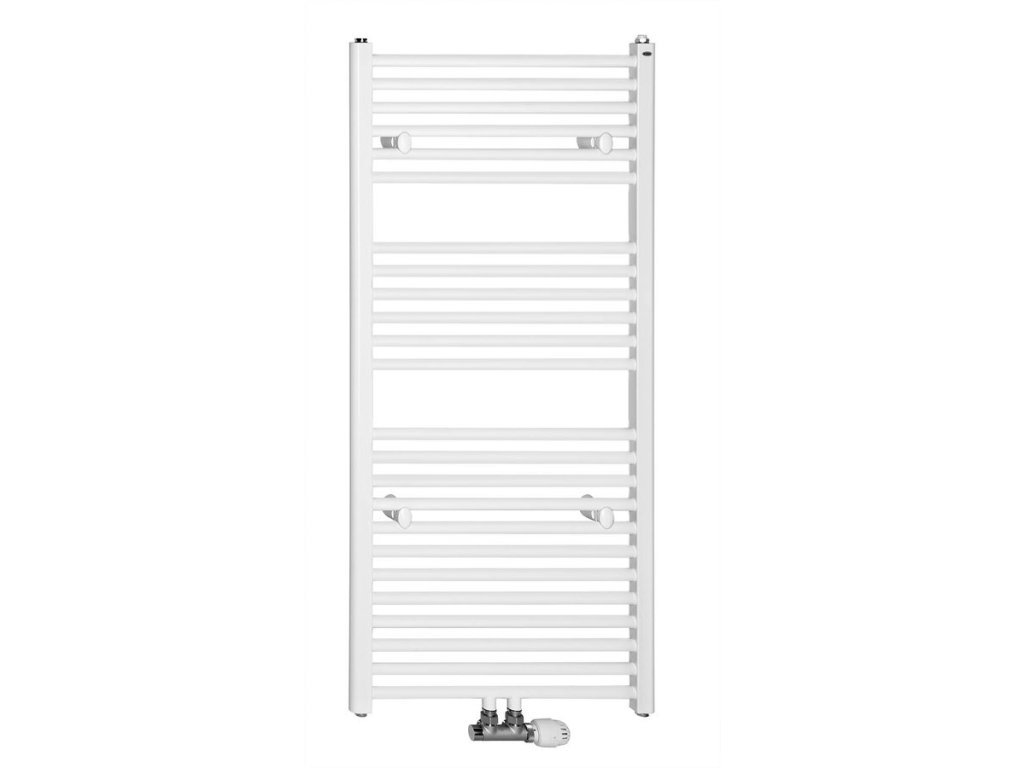Tradičně tvarované otopné těleso z ocelových trubek v bílém provedení s rovnými vodorovnými profily, středové připojení s roztečí 50 mm.