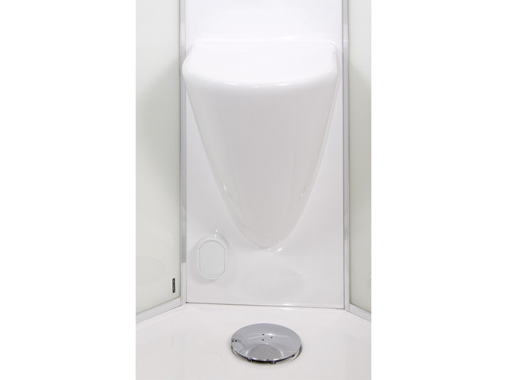 Klasický čtvrtkruhový sprchový box vlastní výroby s posuvnými dveřmi se vyznačuje jednoduchým designem, vysokou kvalitou zpracování. Profil je z leštěného hliníku, prosklení z 5 mm bezpečnostního grape skla, zadní sklo super bílé neprůhledné, šířka vstupu 53 cm. Vanička je z litého mramoru, vlastní výroby, v bílé barvě. Výroba panelu, předního panelu k vaničce a stropu je nyní z kompozitních materiálů, které se používají v leteckém průmyslu. Vůči dříve používané polyesterové pryskyřici je kompozitní materiál ekologičtější, lépe zpracovatelný a při stejné tloušťce výrobku pevnější. Je to také důvod, proč můžeme dosáhnout tak dokonalé povrchové úpravy.