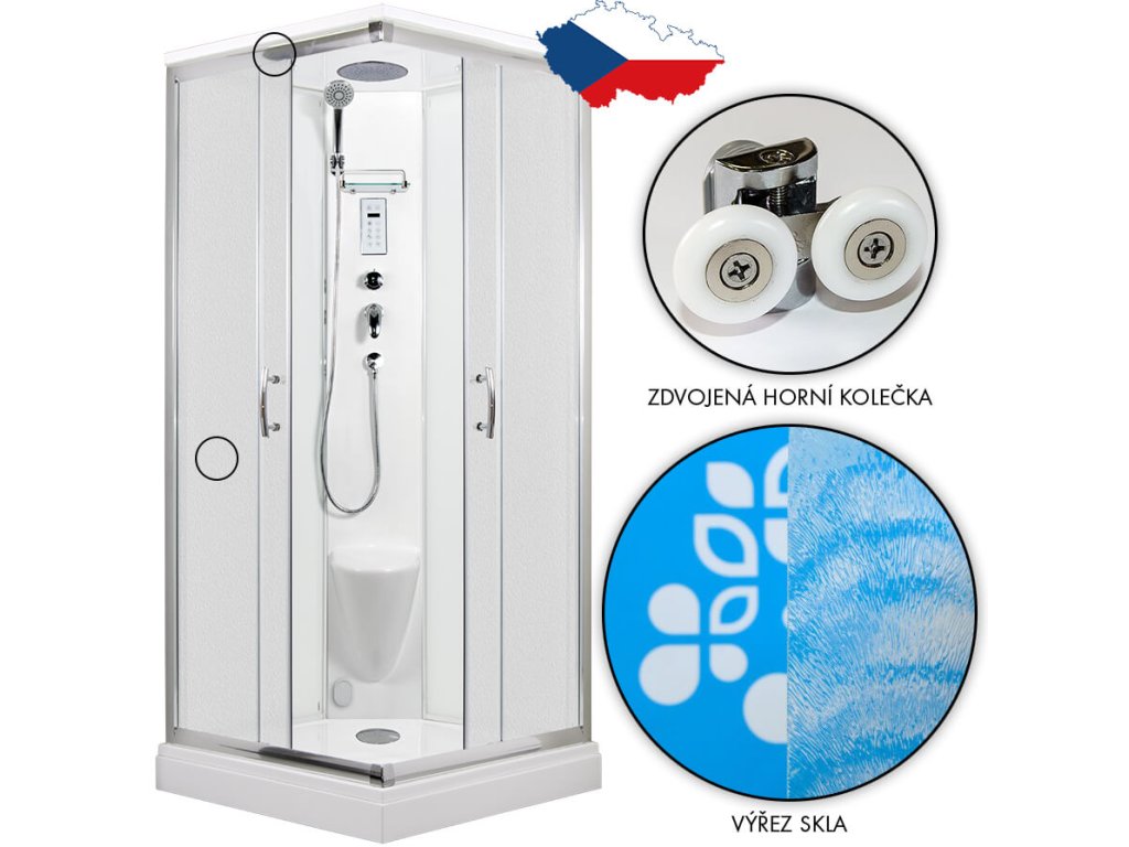 Parní sprchový box vlastní výroby s posuvnými dveřmi čtvercový se vyznačuje jednoduchým designem, vysokou kvalitou zpracování. Profil je z leštěného hliníku, prosklení z 5 mm bezpečnostního chinchila skla, zadní sklo super bílé neprůhledné, šířka vstupu 48 cm. Vanička je z litého mramoru, vlastní výroby, v bílé barvě. Výroba panelu, předního panelu k vaničce a stropu je nyní z kompozitních materiálů, které se používají v leteckém průmyslu. Vůči dříve používané polyesterové pryskyřici je kompozitní materiál ekologičtější, lépe zpracovatelný a při stejné tloušťce výrobku pevnější. Je to také důvod, proč můžeme dosáhnout tak dokonalé povrchové úpravy.