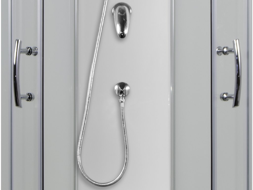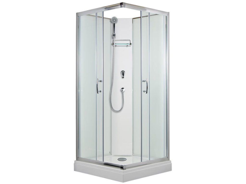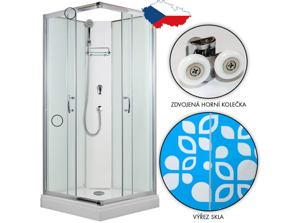 Sprchový box ARTTEC SMARAGD MODEL 1 clear, vlastní výroby, s posuvnými dveřmi čtvercový se vyznačuje vysokou kvalitou a jednoduchým designem. Nabízí vše, co potřebujete k pohodlnému každodennímu sprchování: baterii s ruční sprchou a držákem, poličku a vaničku z litého mramoru.