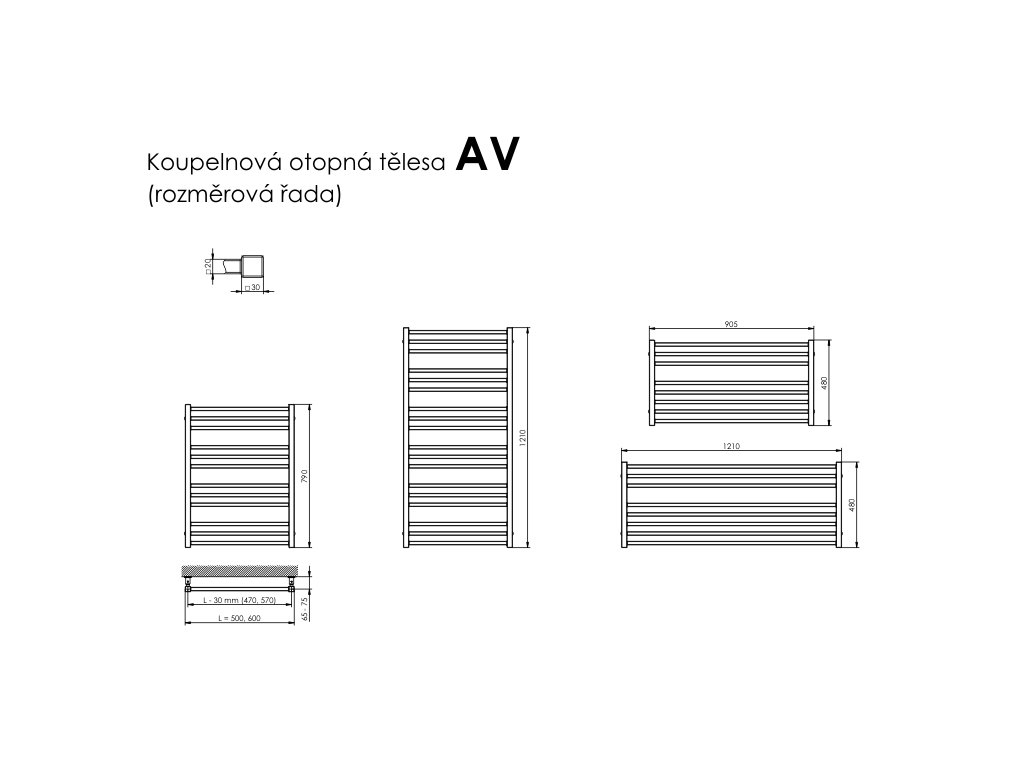 Elektrický radiátor AV splňuje náročné požadavky na design v interiérech moderních koupelen. Skladba hranatých profilů umocňuje technickou eleganci, která dává tělesu nevšední vzhled. Elektrický radiátor AV.ERK je tvořen z příčných ocelových jeklů o 20 x 20 mm a dvou vertikálních ocelových jeklů o rozměru 30 x 30 mm s povrchovou úpravou metalický stříbrný lak. Je plněn nemrznoucí směsí do -7 °C. Je opatřen elektrickým topným tělesem s integrovaným regulátorem prostorové teploty a programem rychlého sušení po dobu 2 hod, je určeno pro přímý ohřev teplonosné látky v koupelnových radiátorech. Topné těleso EL.05 RK je řízeno mikroprocesorem, který zaručuje inteligentní a optimální provoz koupelnového radiátoru. Rozměry : délka 1210 mm, výška 480 mm, hloubka 40 mm, hmotnost 15 kg, provozní napětí 230V, el. příkon 300W, el. třída I, krytí IP44.