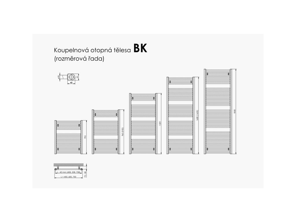 Elektrický radiátor BK je nejpoužívanějším typem mezi koupelnovými radiátory. Jeho elegantní a subtilní vzhled spojený s funkcí sušáku a topidla dodá vaší koupelně komfort a pohodlí s příjemným teplem příznivě ovlivňující i klima vaší koupelny. Elektrické radiátory řady BK.ERK jsou standardně dodávány s povrchovou úpravou bílé komaxitové barvy RAL 9016. BK.ERK je vyroben z příčných ocelových trubek ø 20 mm a dvou vertikálních ocelových stojin ve tvaru D o rozměru 35 x 40 mm. Elektrické radiátory jsou plněny speciální nemrznoucí směsí do -7 °C. Je opatřen elektrickým topným tělesem s integrovaným regulátorem prostorové teploty a programem rychlého sušení po dobu 2 hod, je určeno pro přímý ohřev teplonosné látky v koupelnových radiátorech. Topné těleso EL.05 RK je řízeno mikroprocesorem, který zaručuje inteligentní a optimální provoz koupelnového radiátoru. Rozměry: délka 450mm, výška 1320mm, hloubka 30mm hmotnost 15kg, provozní napětí 230V, el.příkon 500W, el. třída I, krytí IP44