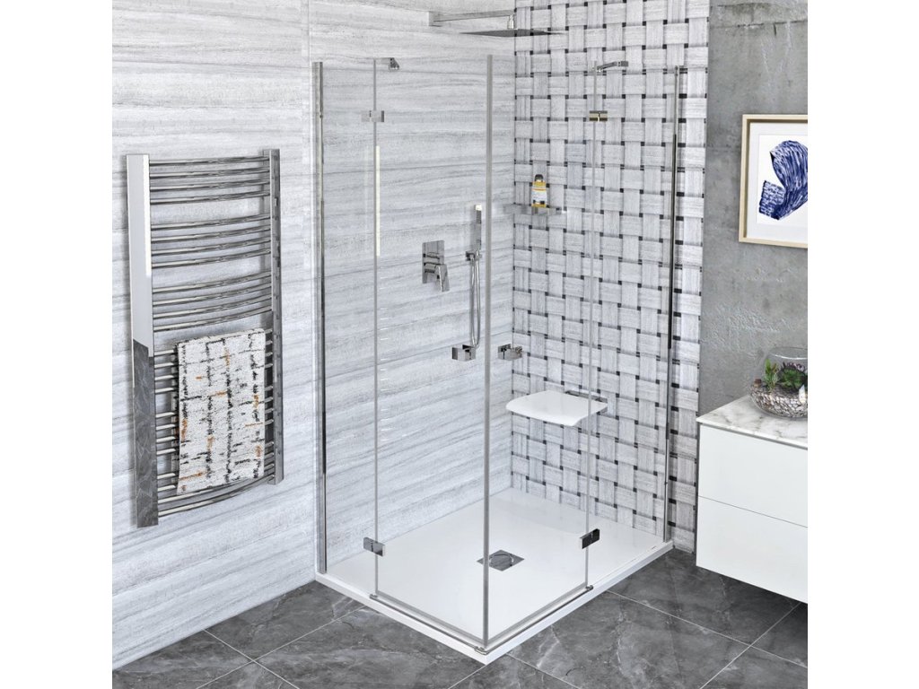 Bezrámové pantové zástěny FORTIS v moderním hranatém designu. Minimalistické pochromované panty v nekompromisním hranatém designu, zevnitř zapuštěné pro snadné čištění a se zvedací funkcí pro pohodlné otevírání. Bezpečnostní čiré sklo v tloušťce 8 mm je ošetřené povrchovou úpravou ANTIDROP pro snadné čištění. Výška 2000 mm. Hranaté pochromované madlo ve stejném minimalistickém designu jako panty.