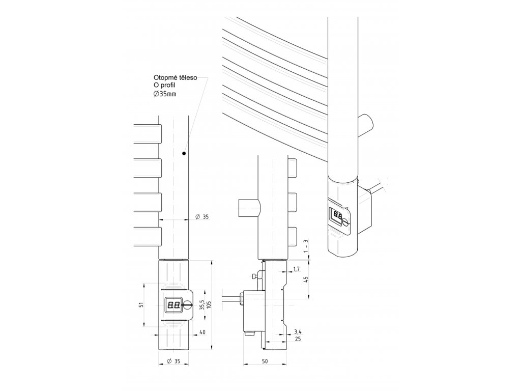 - Regulace volitelně dle teploty vody v otopném tělese (vhodné pro sušení) nebo dle teploty vzduchu v místnosti (vhodné pro vytápění)