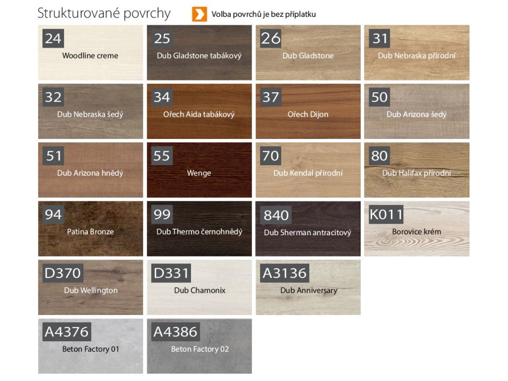 | Dekor: | Beton, Borovice, Dub, Ořech, Wenge |
