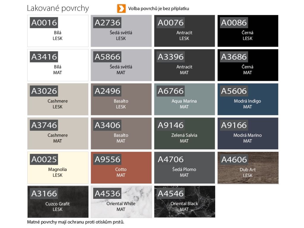 - Lakované provedení MDF 18 - 22 mm, sedmivrstvý nástřik PUR (polyuretanovými) barvami ve vysokém lesku nebo matu.