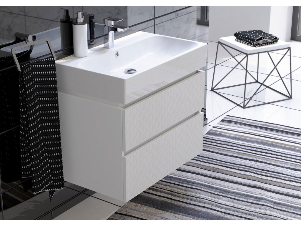 Koupelnový nábytek STORM 3D je osazen keramickými umyvadly CeraStyle PINTO ve velikostech 75, 100, 120 a 150 cm s hloubkou 46,5 cm.