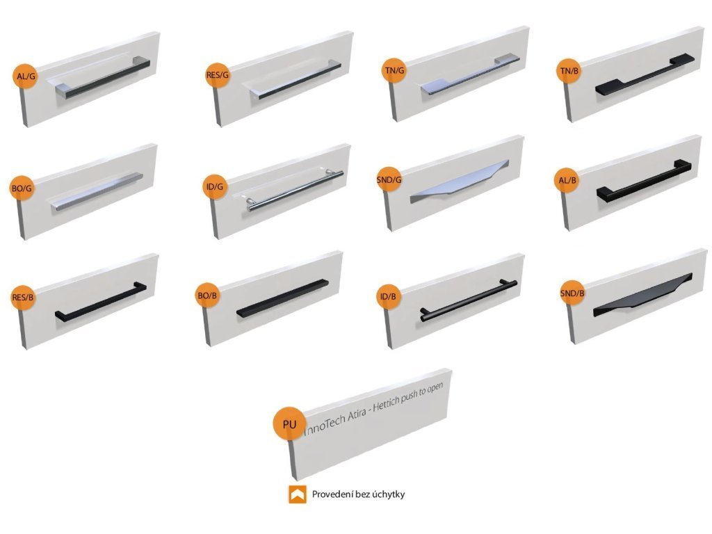 - Zásuvky (Hettich, Blum, Strong) jsou opět vždy vybaveny tlumeným dovíráním (soft closing), nebo v provedení bez úchytek (InnoTech Atira - Hettich Push to open).