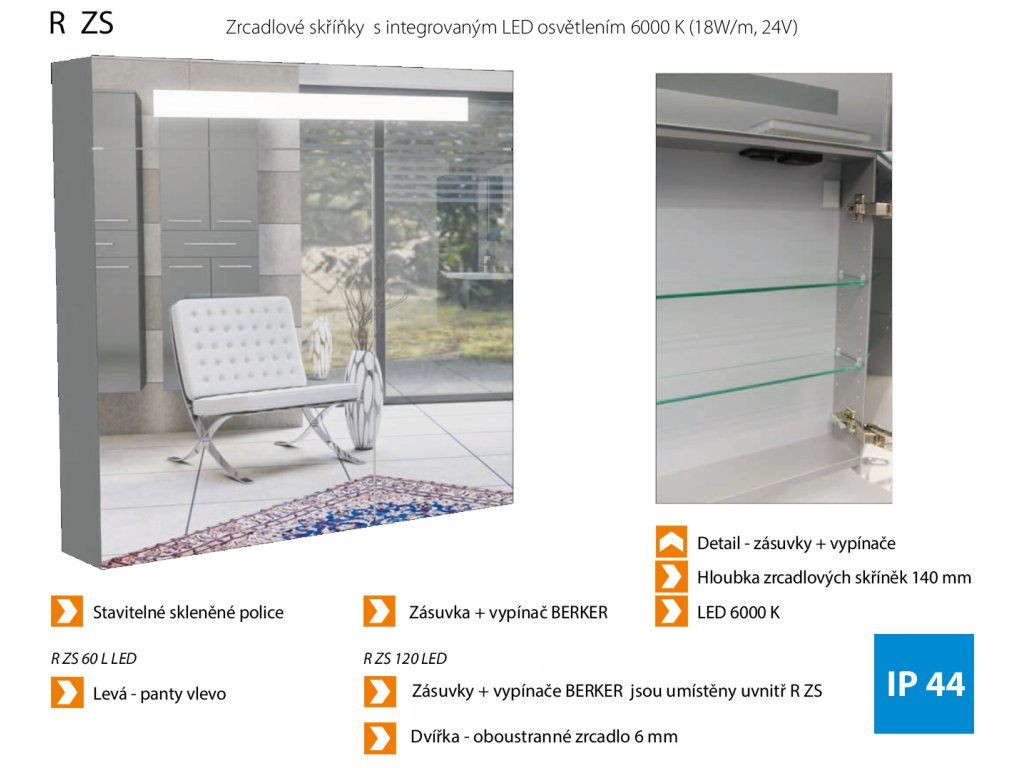 Koupelnová zrcadlová skříňka R ZS 60 L s LED osvětlením R ZS - integrované patentově chráněné LED osvětlení v zrcadlových dvířkách. 6mm zrcadlová dvířka, stavitelné skleněné police. SOUČÁSTÍ zásuvka s vypínačem BERKER, elektrické krytí IP44.