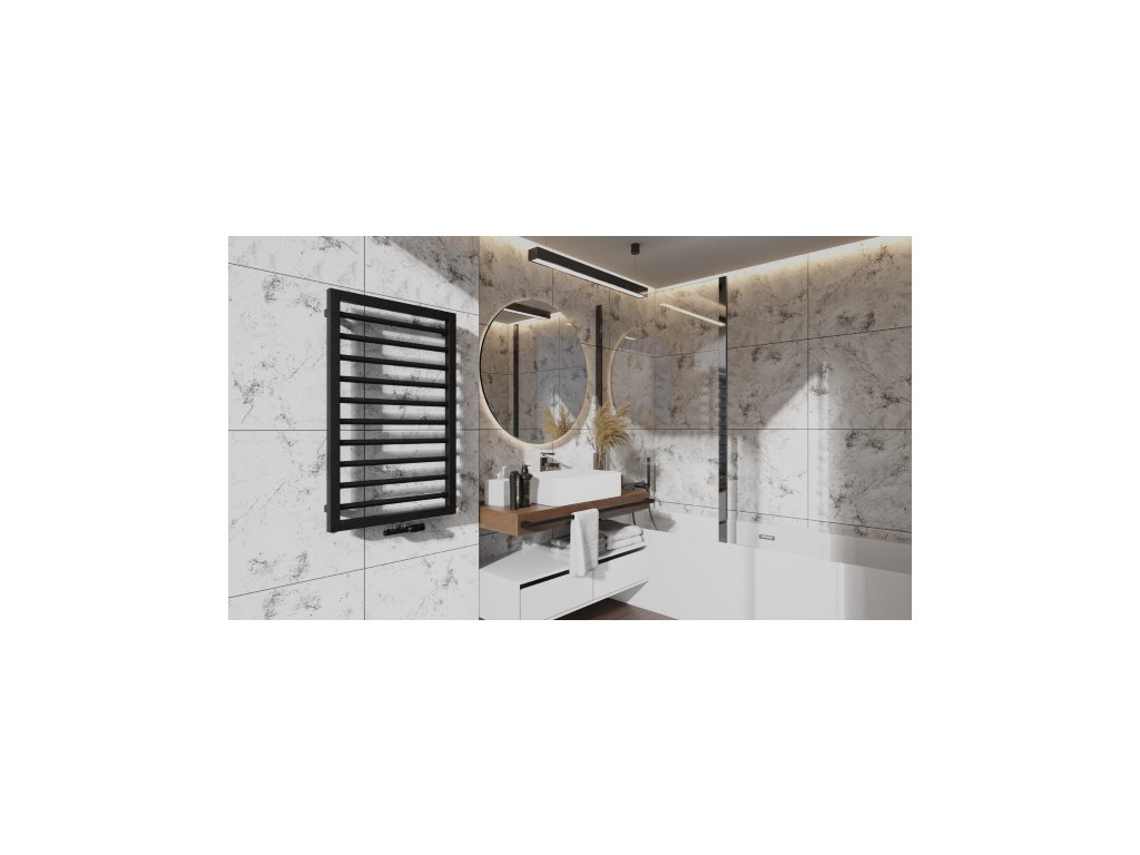 Moderní koupelnový žebřík, který v sobě kombinuje sofistikovaný design a vysokou funkčnost. Jeho jedinečný vzhled tvoří kulaté trubky zasazené do hranatých profilů v pevném rámu.