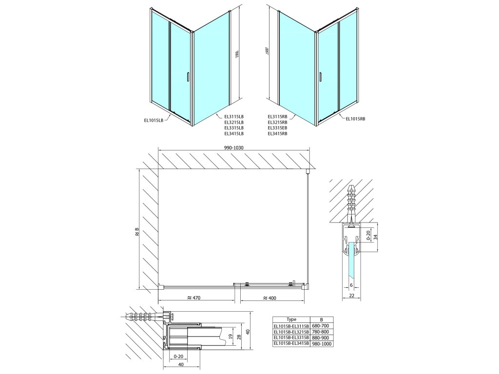 - Instalační rozměr dveří do niky lze díky rozšiřovacímu profilu EL825 zvětšit o 25 mm na každou stranu, celkem o 50 mm
