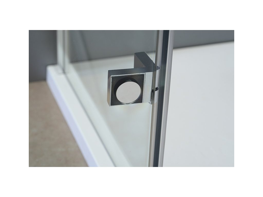 | Pochromované madlo | Mosazné pochromované panty se zvedací funkcí... | ... z vnitřní strany zapuštěné do skla | Stabilitu zástěn zajišťuje rohová vzpěra |
