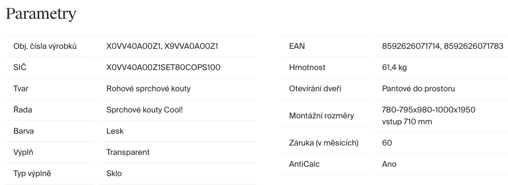 Sprchový kout je složen ze dvou samostatných produktů, sprchových dveří (COSD1 80) a pevné stěny (COPS 100). Otočením sprchových dveří (COSD1 80) o 180° získáte levou nebo pravou variantu otevírání. Montuje se do obloženého rohu koupelny na vaničky Ravak Perseus Pro, Perseus Pro Flat, Perseus Pro Chrome nebo přímo na podlahu se zabudovaným odtokovým žlabem či podlahovou vpustí. Vzpěra je součástí balení dveří.
