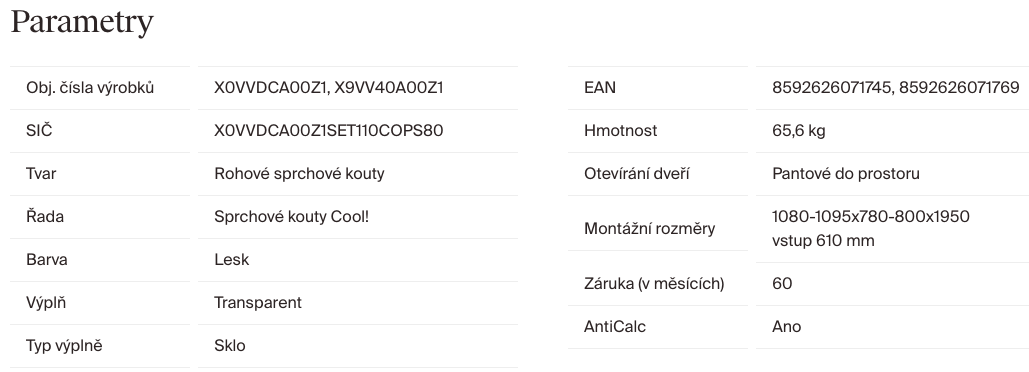 | Hloubka sprchových dveří: | 80 cm |