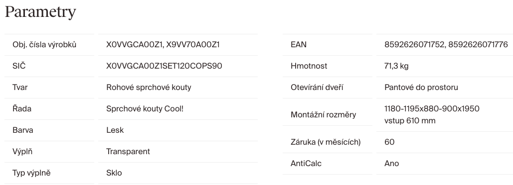 | Výbava: | Bez vaničky, S pevnou stěnou |