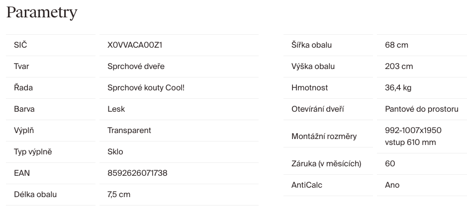 | Výbava: | Bez vaničky, S pevnou stěnou |