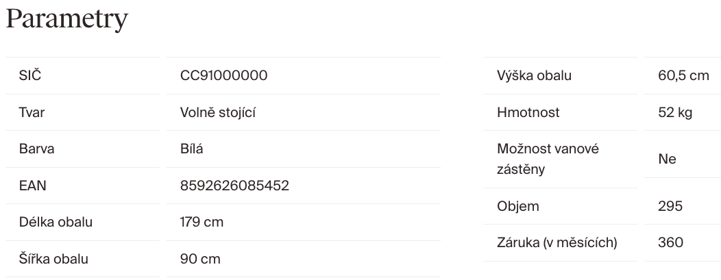 Vanu nelze doplnit vanovou zástěnou. Vanový odtokový komplet (tj. přepad, pileta, sifon, zápachová uzávěra) a podpora (nožičky) jsou součástí balení. Krytka odtoku s funkcí ClickClack je dodávána v černé barvě. Balení 3v1 navíc obsahuje i bílou a chromovou variantu pro snadnou výměnu podle vašich preferencí.