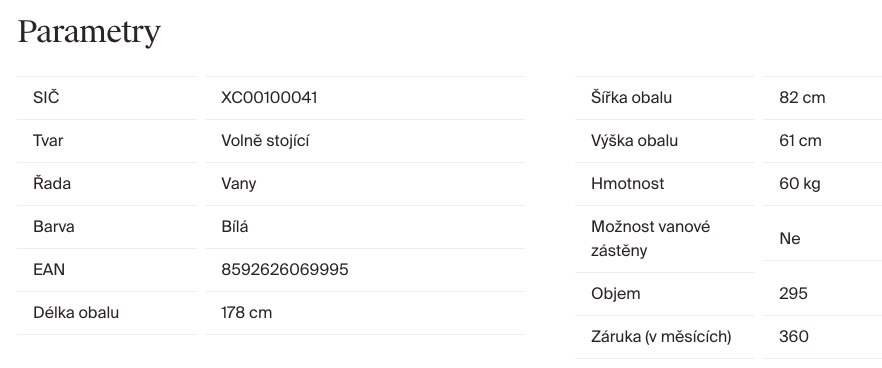 Vanu nelze doplnit vanovou zástěnou. Vanový odtokový komplet (tj. přepad, pileta, sifon, zápachová uzávěra) a podpora (nožičky) jsou součástí balení. Krytka odtoku s funkcí ClickClack je dodávána v bílé barvě. Balení 3v1 navíc obsahuje i černou a chromovou variantu pro snadnou výměnu podle vašich preferencí.