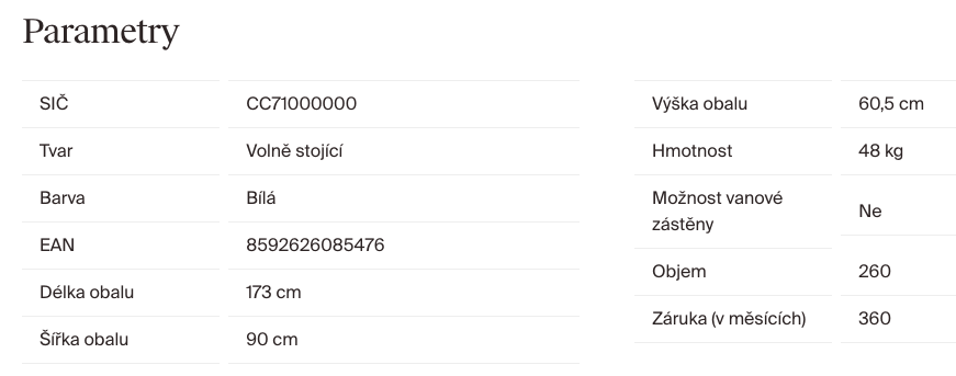 Vanu nelze doplnit vanovou zástěnou. Vanový odtokový komplet (tj. přepad, pileta, sifon, zápachová uzávěra) a podpora (nožičky) jsou součástí balení. Krytka odtoku s funkcí ClickClack je dodávána v bílé barvě. Balení 3v1 navíc obsahuje i černou a chromovou variantu pro snadnou výměnu podle vašich preferencí.