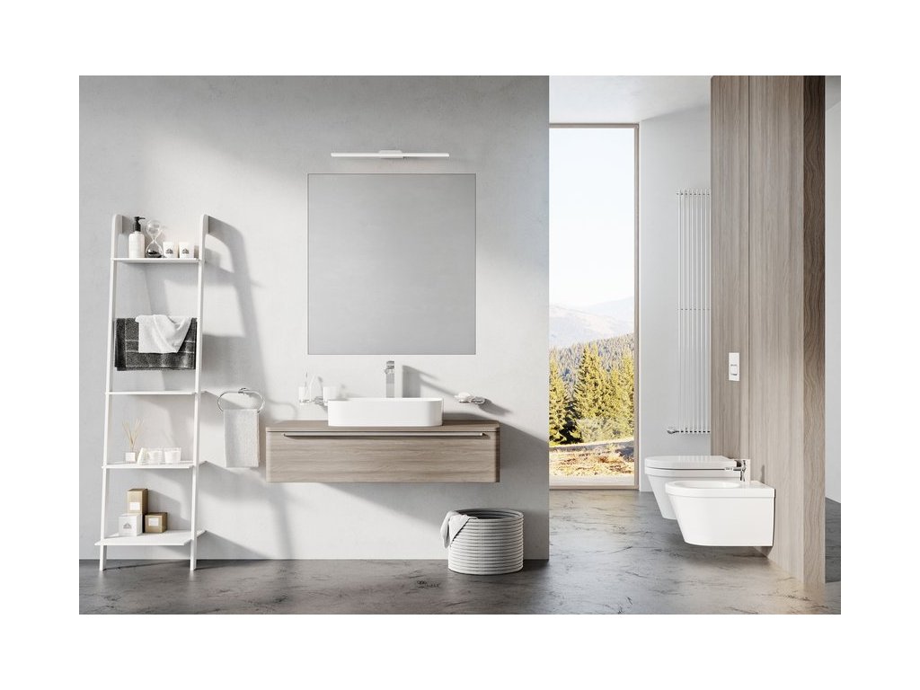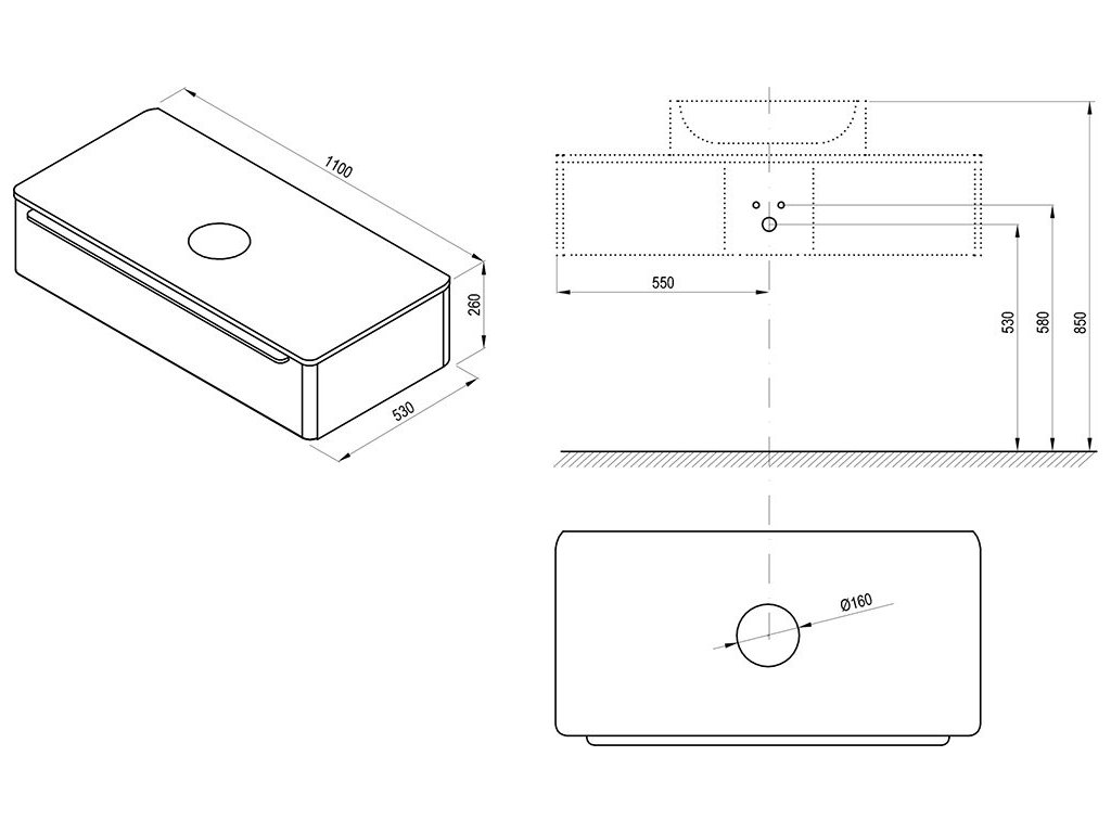 Designový solitér k umyvadlům na desku s velkorysým úložným prostorem a elegantním hliníkovým madlem.rozměry (šxhxv): 110 x 53 x 26 cm