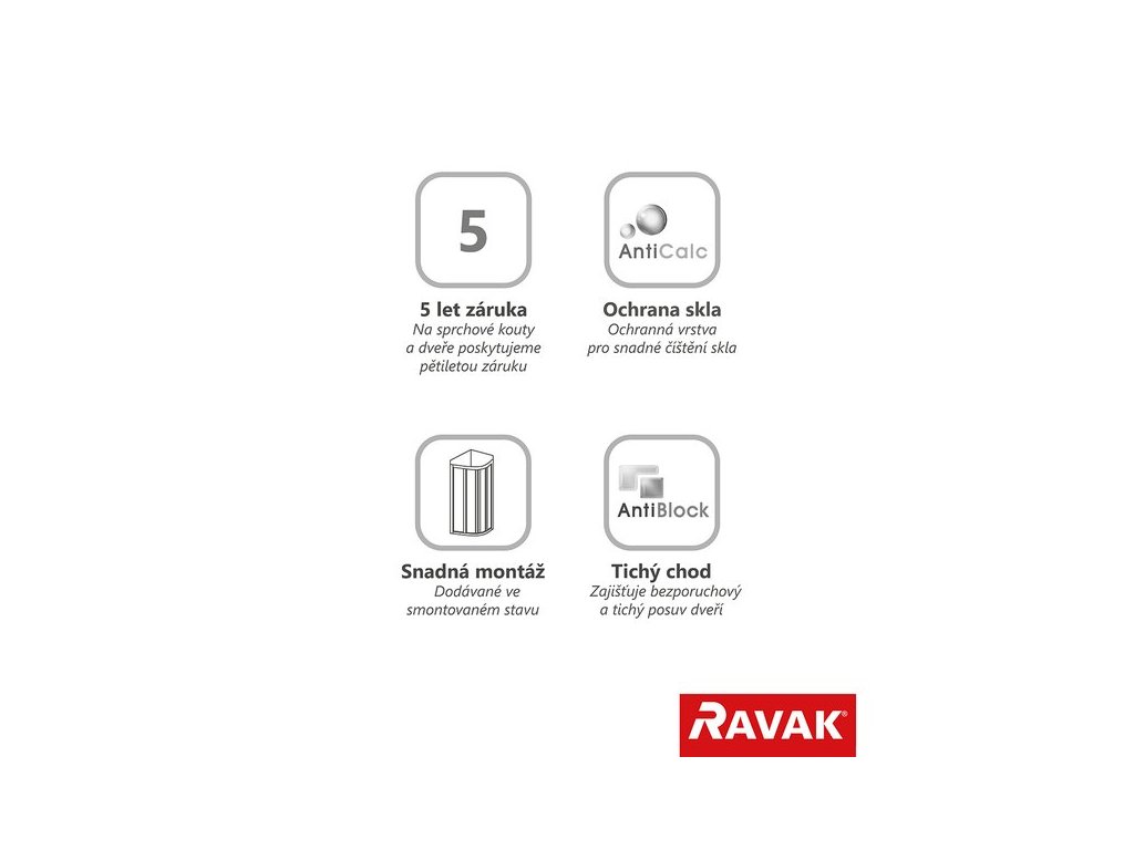 Vodotěsnost výrobku musí být zároveň zaručena postupem montáže dle montážního návodu výrobce. Další podmínkou optimální funkčnosti je kombinace výrobků jedné značky – ke sprchovým koutům RAVAK doporučujeme vaničky naší produkce, které byly v rámci vývoje otestovány s ostatními výrobky RAVAK.