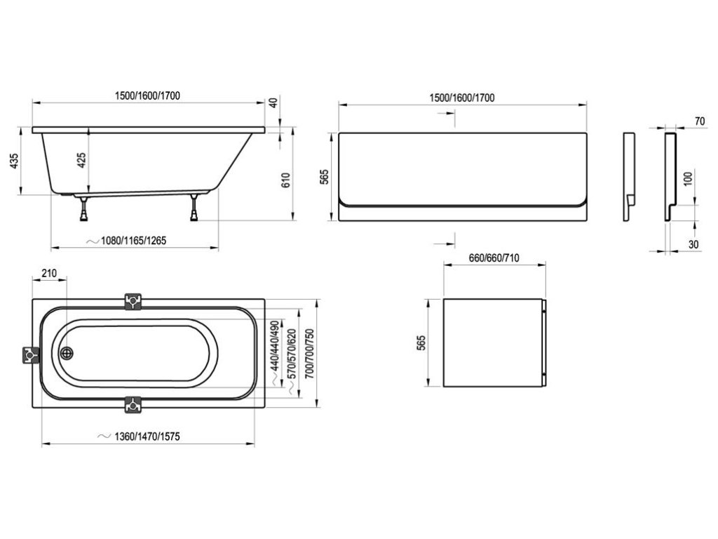 - doplňky k dokoupení: podpora, čelní a boční panel, vanový odtokový komplet