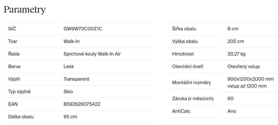 - šířka skleněné pevné stěny Walk-In Air Wall: 90 cm