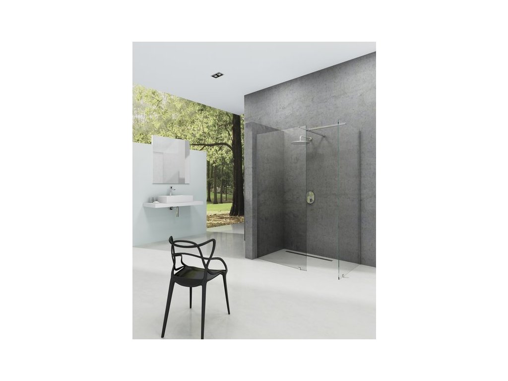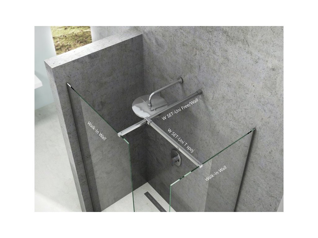 Sprchovací prostor pak uzavírá boční skleněná pevná stěna Walk-In Wall. Tuto skleněnou stěnu zajišťuje spojovací kovová vzpěra (W SET-Uni T spoj) o délce 1200 mm, která se montuje na první vzpěru, a díky ní si zvolíte šířku vstupu do sprchovacího prostoru (max. 110 cm). V případě potřeby lze i tuto vzpěru ze strany napojení zkrátit.