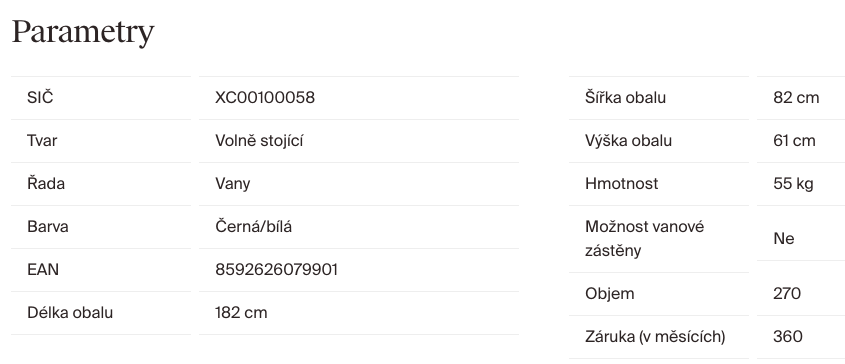 Vanu nelze doplnit vanovou zástěnou. Vanový odtokový komplet (tj. přepad, pileta, sifon, zápachová uzávěra) a podpora (nožičky) jsou součástí balení. Krytka odtoku s funkcí ClickClack je dodávána v bílé barvě. Balení 3v1 navíc obsahuje i černou a chromovou variantu pro snadnou výměnu podle vašich preferencí. K vaně nabízíme i volně stojící baterii zabudovatelnou do podlahy. Veškerý rozvod musí být veden podlahou (jak odpadový, tak přívody vody pro podlahovou baterii).