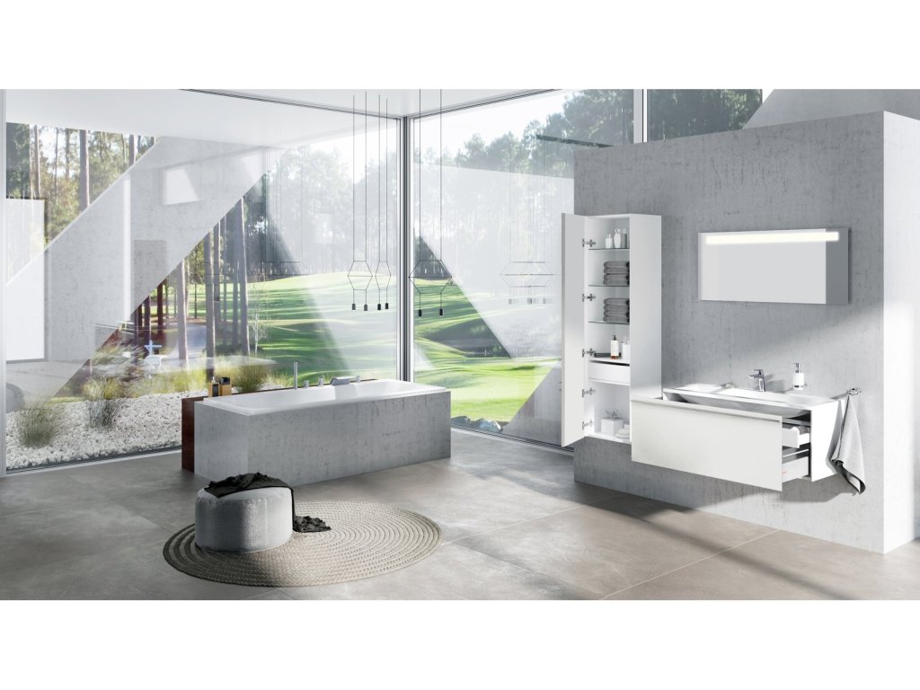 Umyvadlová skříňka v zásuvce schová vše, co nemá být na očích. Do vysoké skříňky uložíte cokoli, co chcete mít v koupelně po ruce.