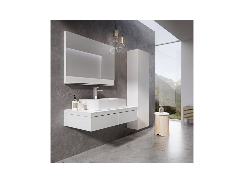 Skříňka pod umyvadlo na desku nabízí prostor nejen kolem umyvadla, ale i pod ním. Zásuvky uloží vše, co nemá být na očích. Do vysoké skříňky se vejde cokoliv, bez čeho se v koupelně neobejdete. Zrcadlo poskytuje další místo na skleněné poličce.