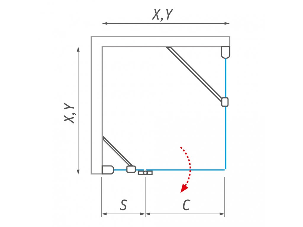 Čtvercový sprchový kout s jednokřídlými dveřmi a pevnou stěnou