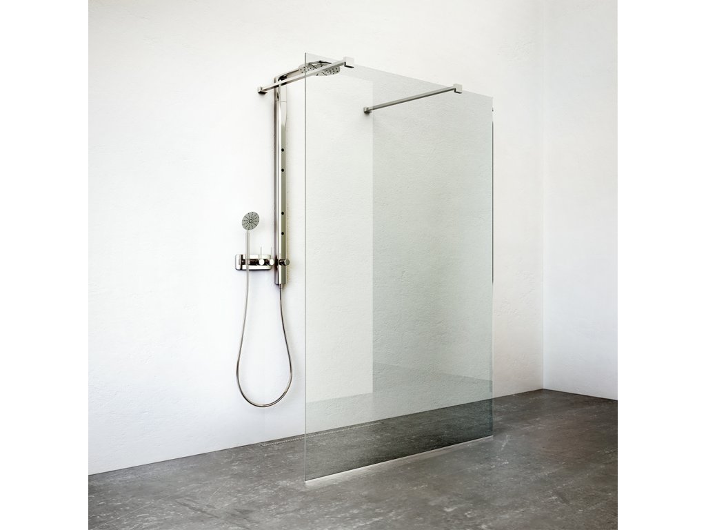 Sprchová zástěna je upevněna ke zdi pomocí dvou hliníkových vzpěr v povrchové úpravě Brillant, jež zajišťují perfektní stabilitu. Ochranná hliníková lišta na spodní hraně skla rovnoměrně rozloží případné nerovnosti na podlaze. Tyto prvky dotváří jednotný design celé sprchové zástěny.