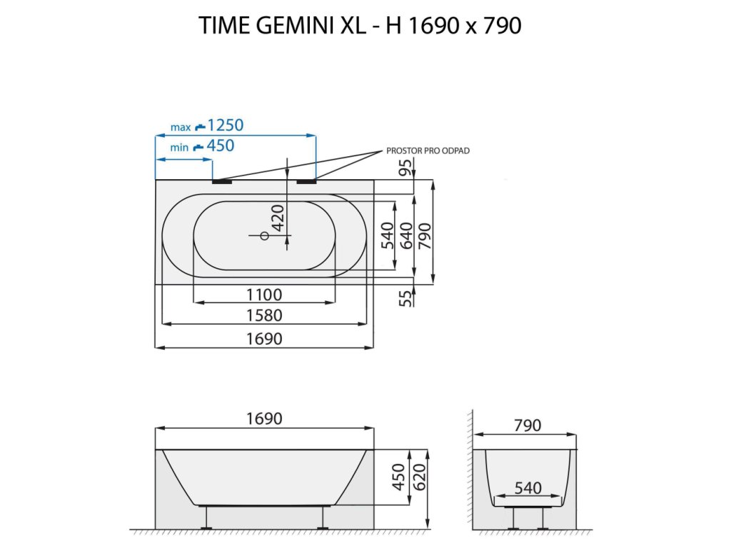 Pro milovníky hranatých tvarů jsme navrhli solitérní vanu TIME GEMINI XL - H. Širší lem u stěny můžete využít na odložení hygienických potřeb nebo je ideálním místem pro instalaci stojánkové vanové baterie. Velkorysý vnitřní prostor s nadstandardní šířkou dna 54 cm bude vyhovovat i osobám plnějších tvarů. TIME GEMINI XL - H umístíte ke stěně s milimetrovou přesností.