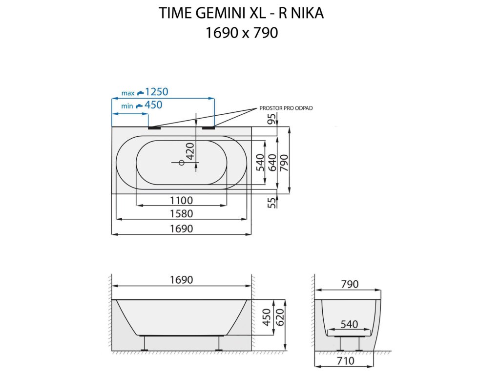 Volně stojící vana TIME GEMINI XL R - NIKA se vyznačuje zaobleným předním panelem, čímž vytváří prostor pro snadný vstup do vany. Je vhodná pro umístění do niky. Širší lem u stěny můžete využít na odložení hygienických potřeb nebo je ideálním místem pro instalaci stojánkové vanové baterie. Velkorysý vnitřní prostor s nadstandardní šířkou dna 54 cm bude vyhovovat i osobám plnějších tvarů.