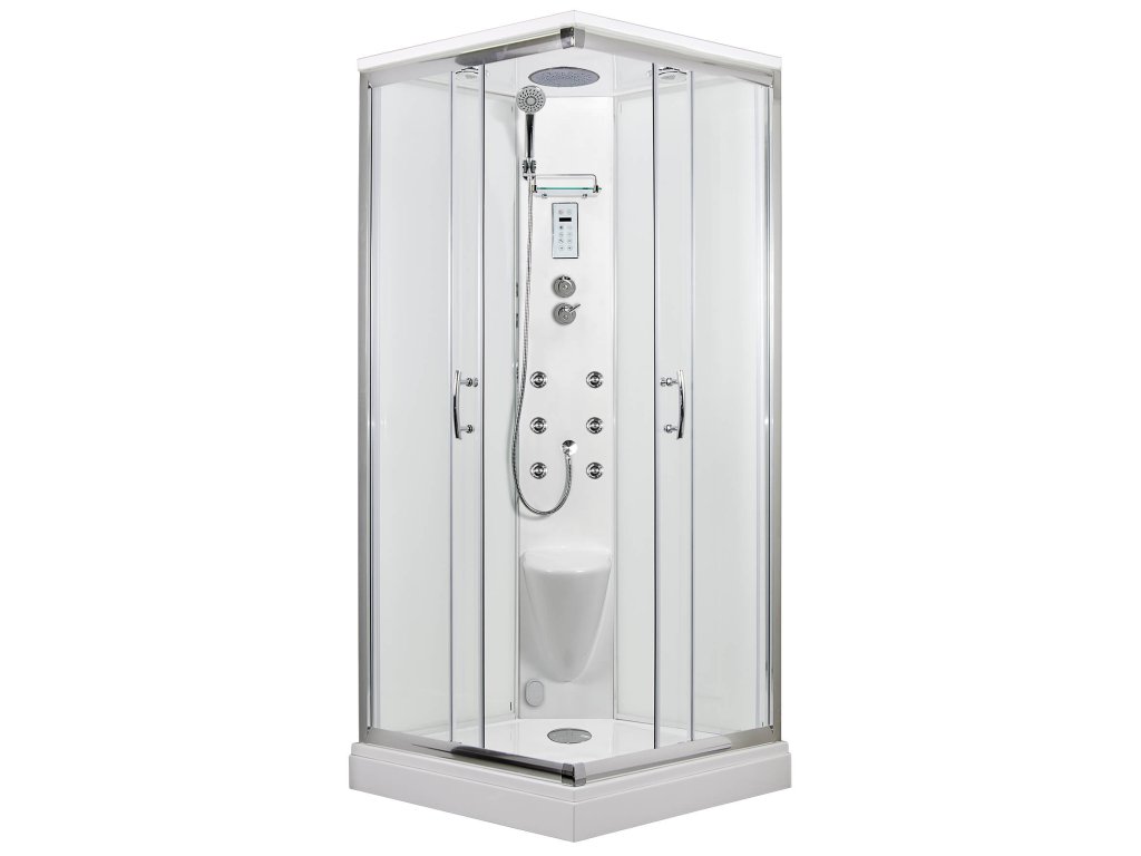 Parní sprchový box vlastní výroby s posuvnými dveřmi čtvercový se vyznačuje jednoduchým designem, vysokou kvalitou zpracování. Profil je z leštěného hliníku, prosklení z 5 mm bezpečnostního chinchila skla, zadní sklo super bílé neprůhledné, šířka vstupu 48 cm. Vanička je z litého mramoru, vlastní výroby, v bílé barvě. Výroba panelu, předního panelu k vaničce a stropu je nyní z kompozitních materiálů, které se používají v leteckém průmyslu. Vůči dříve používané polyesterové pryskyřici je kompozitní materiál ekologičtější, lépe zpracovatelný a při stejné tloušťce výrobku pevnější. Je to také důvod, proč můžeme dosáhnout tak dokonalé povrchové úpravy.