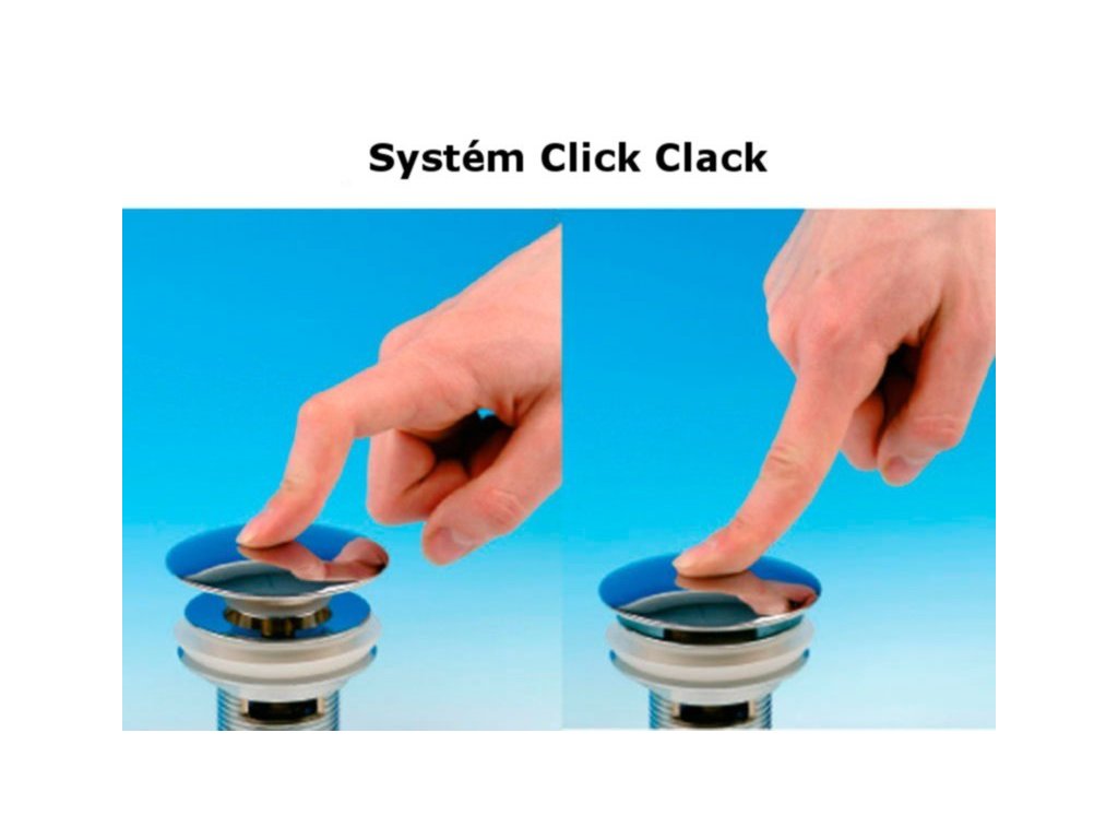 Klik Klak (Click-Clack) je moderní variantou výpustí do umyvadel. Již nemusíte přemýšlet, kam odložit gumovou zátku, nebude překážet řetízek, ani vás nebude otravovat nepohodlné ovládání zátky pomocí táhla u baterie. Systém Klik Klak je ovládán pouhým stlačením zátky.