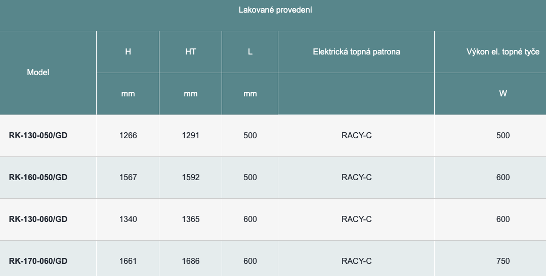 Topná tyč Racy je vestavěná ve výrobě, nelze ji objednat samostatně.