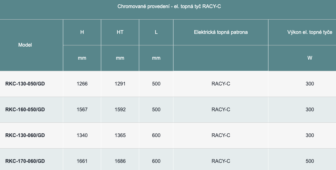 Topná tyč Racy je vestavěná ve výrobě, nelze ji objednat samostatně.