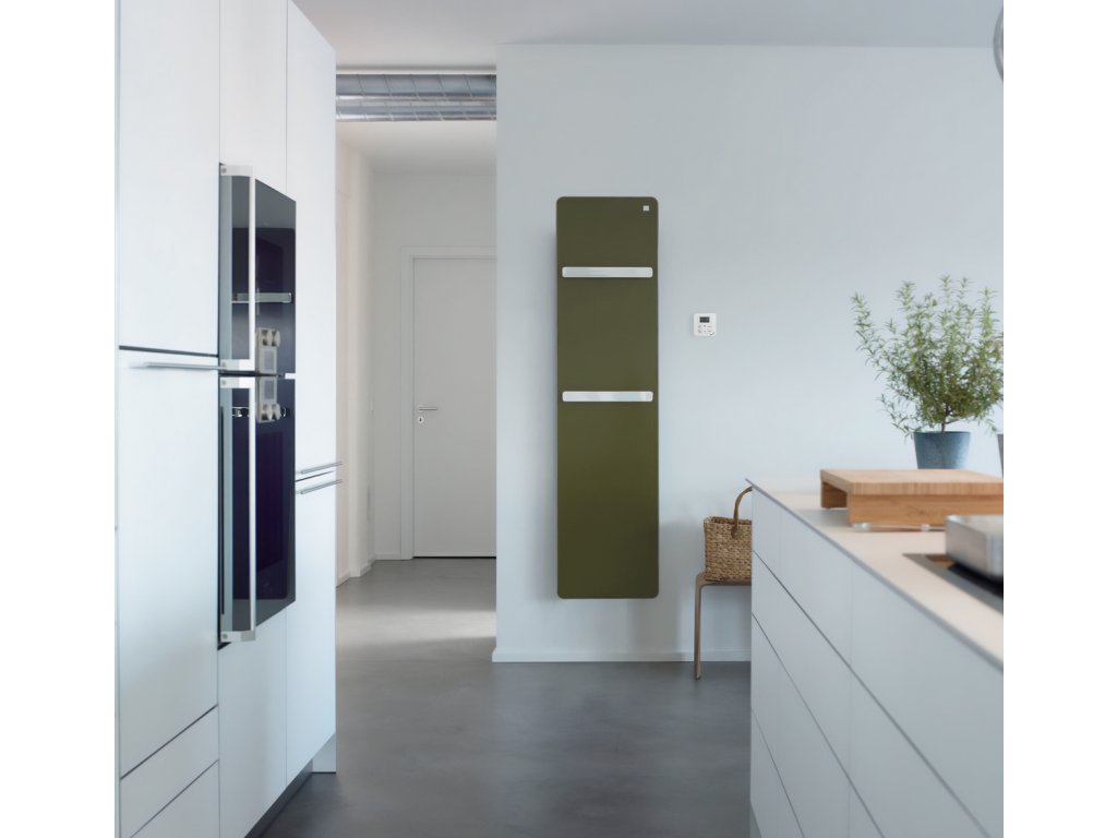 Designový radiátor Zehnder Vitalo Bar s přední a zadní deskou vyrobenou z aluminia a elektrickými topnými elementy v hliníkovo/grafitové konstrukci.