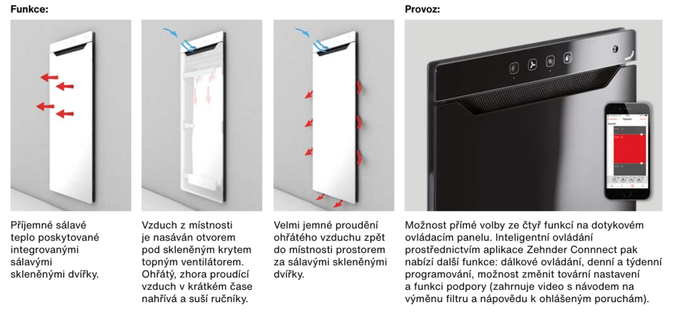 Komfortní topný modul Zehnder Zenia sestává z rámu pro předinstalaci a topného tělesa pro finální montáž. Pro předinstalaci lze zvolit vnitřní montážní rám nebo vnější designový kryt. Vnitřní montážní rám, vyrobený z pozinkované oceli, je určen pro vestavěnou instalaci topného tělesa (do předstěnové sádrokartónové nebo zděné konstrukce) nebo pro vestavbu do nábytku. Vnější designový kryt, vyrobený z hliníku a následně lakovaný v barvě White Aluminium, je určen pro nástěnnou instalaci topného tělesa. Topné těleso sestává z vnitřního tělesa a sálavých skleněných dvířek s možností závěsů vlevo nebo vpravo. Vnitřní těleso z umělé hmoty obsahuje topný ventilátor, skleněný kryt s dotykovým ovládacím panelem a Bluetooth modul. Součástí sálavých skleněných dvířek je držák na ručníky pro nahřátí a sušení až dvou osušek o velikosti 140 x 70 cm. Topný modul může být ovládán buď prostřednictvím intuitivního ovládacího panelu nebo individuálně nastavenou aplikací (k dispozici pro oba operační systémy iOS a Android). Možnost samostatného provozu nebo kombinace dvou funkcí: sálavá skleněná dvířka (infračervené vytápění) a topný ventilátor s funkcemi: Boost, nahřátí ručníků nebo rychlé sušení ručníků, každá funkce má přednastavený časový interval, který lze změnit prostřednictvím aplikace.